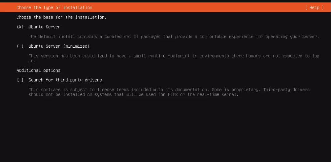 در مرحله «The type of installation» مشخص میکنید که اوبونتو به چه شکلی نصب شود. در این آموزش، گزینه «Ubuntu Server» انتخاب میشود. این گزینه نسخهای از اوبونتو را نصب میکند که بهطور اختصاصی برای استفاده در سرورها بهینه شده است.